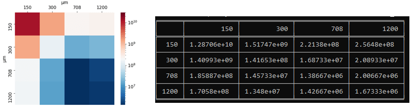 While making a code for outputs of particle statistics is relatively straight forward for simulations with a single particle size, what if we want a particle size distribution (PSD)? This is where filtering comes to view. We need to compartmentalize collisions between particle size fractions while also allowing something that us humans can interpret to further help optimization of the industrial unit. For example, shown in Figure1 is particle collision frequency of a simulation that I have previously performed for the company funding my research (DISA©). We then compare such information between simulations to determine which design we would like. For example, do we want a larger collision frequency of “like” sized particles or do we want more larger particles hitting the smaller ones?